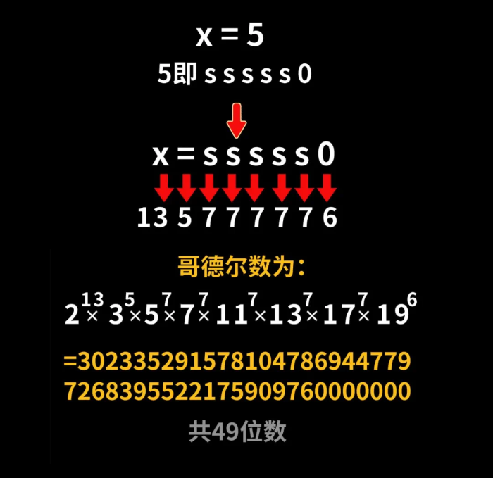 然后將質(zhì)數(shù)從小到大排列,將各個(gè)符號(hào)的哥德?tīng)枖?shù)按順序放到指數(shù)位置,整體相乘得到的數(shù)字就是整個(gè)等式的哥德?tīng)枖?shù)。