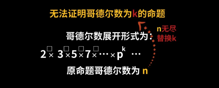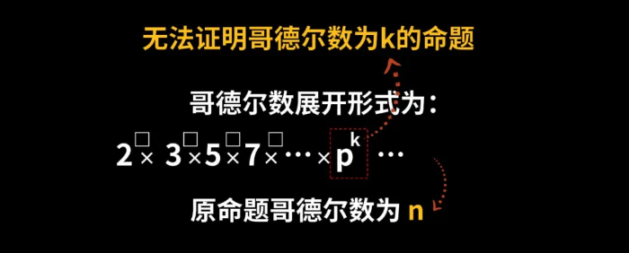 那么這個(gè)命題會(huì)存在一個(gè)哥德?tīng)枖?shù),展開(kāi)形式是這樣的,必定有某個(gè)質(zhì)數(shù)的指數(shù)為k,來(lái)對(duì)應(yīng)命題中出現(xiàn)的k這個(gè)數(shù)字,這個(gè)哥德?tīng)枖?shù)很大,我們假定它為:n