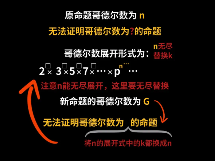 恰好對(duì)應(yīng)的就是:無(wú)法證明哥德?tīng)枖?shù)為“將n的展開(kāi)式中的k都換成n”的命題。