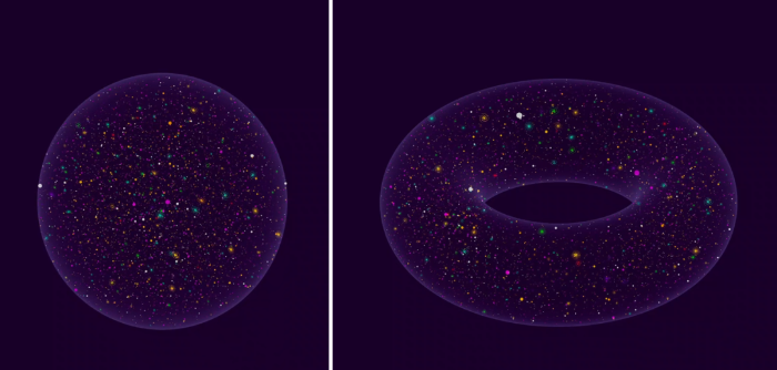 地球的表面是一個球體,但宇宙整體可能具有其他形狀。例如,可以想象成一個環(huán)面(類似甜甜圈的形狀)。在這種情況下,光線有多種路徑可以繞著環(huán)面的表面?zhèn)鞑?,并回到原點。光線可以繞著甜甜圈的外部環(huán)繞,也可以穿過中間的孔環(huán)繞。不論哪種方式,光最終都會回到起點